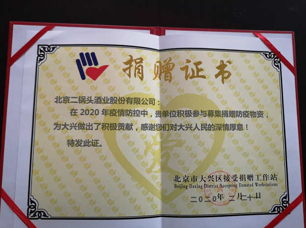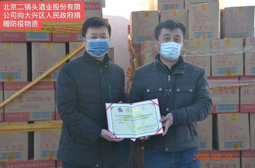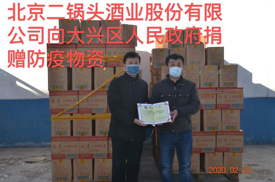 北京二锅头酒业公司向大兴区政府捐赠防疫物资